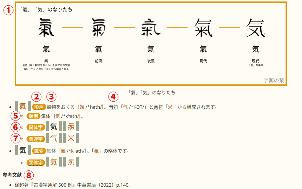 - ③:その漢字が何という語を表記するために作られた字なのか(本義)。発音記号は基本的に上古音を表示します。